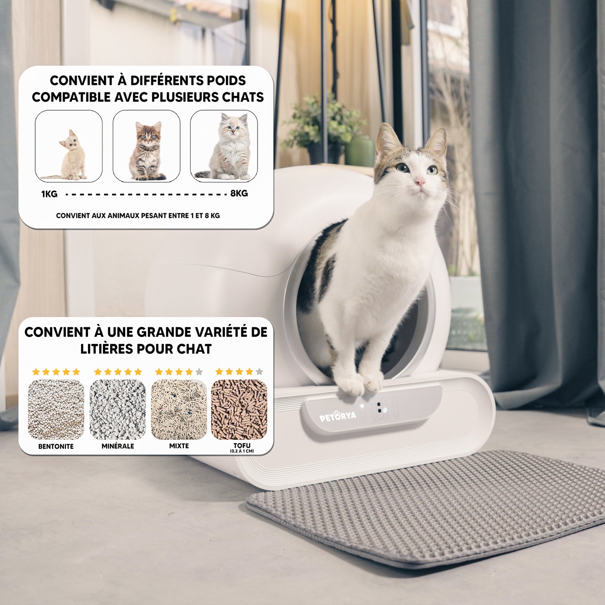 🛡️ Grâce à plusieurs capteurs infrarouge, 4 capteurs de poids et à une rotation lente, votre compagnon ne risque ni blocage ni pincement, même pour les chatons les plus curieux. La litière fonctionne avec les principales litières agglomérantes, silice ou tofu et reste adaptée aux foyers avec plusieurs chats.